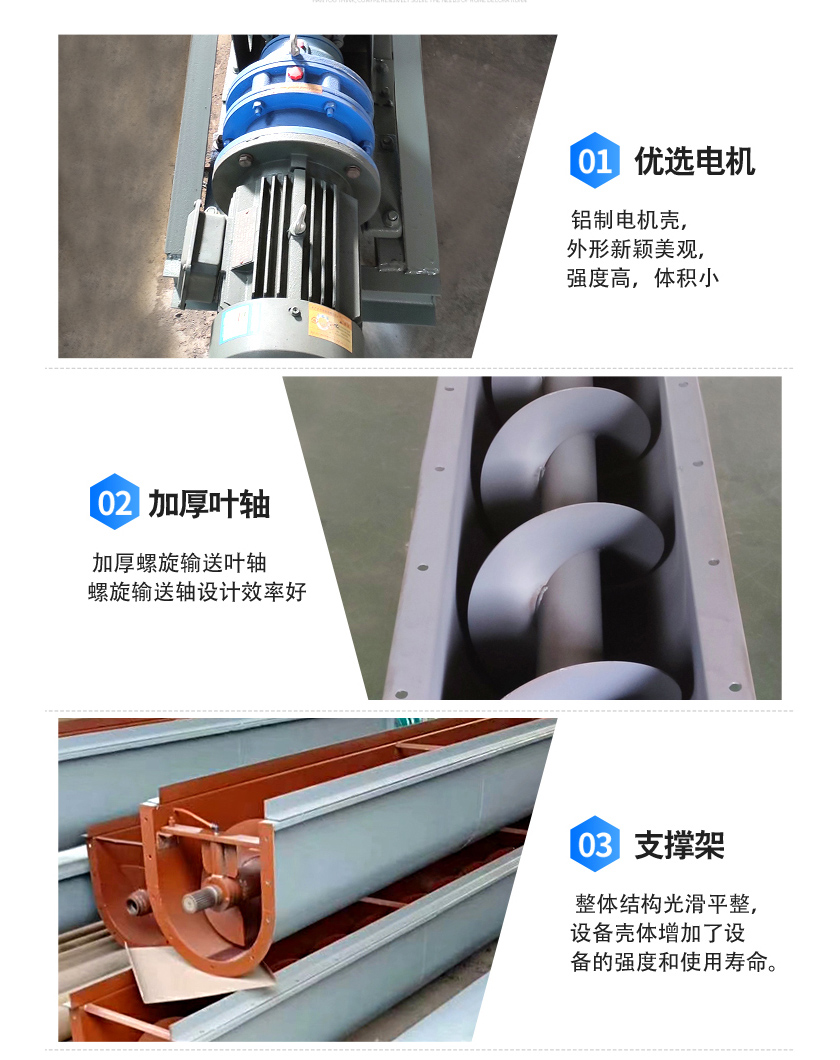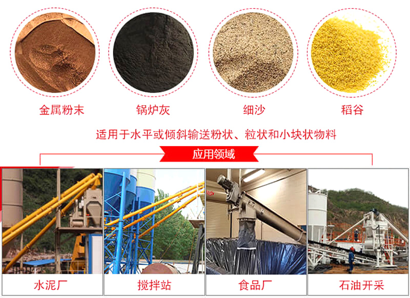 沙子螺旋輸送機(jī)適用于建材、化工、電力、冶金、煤炭、糧食等行業(yè),適用于水平或傾斜輸送粉狀、粒狀和小塊狀物料,如煤、灰、渣、水泥、糧食等,物料溫度小于200℃。