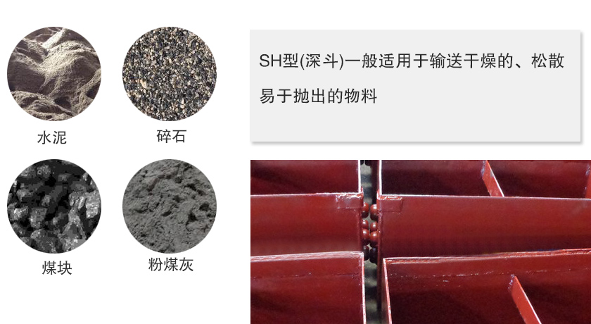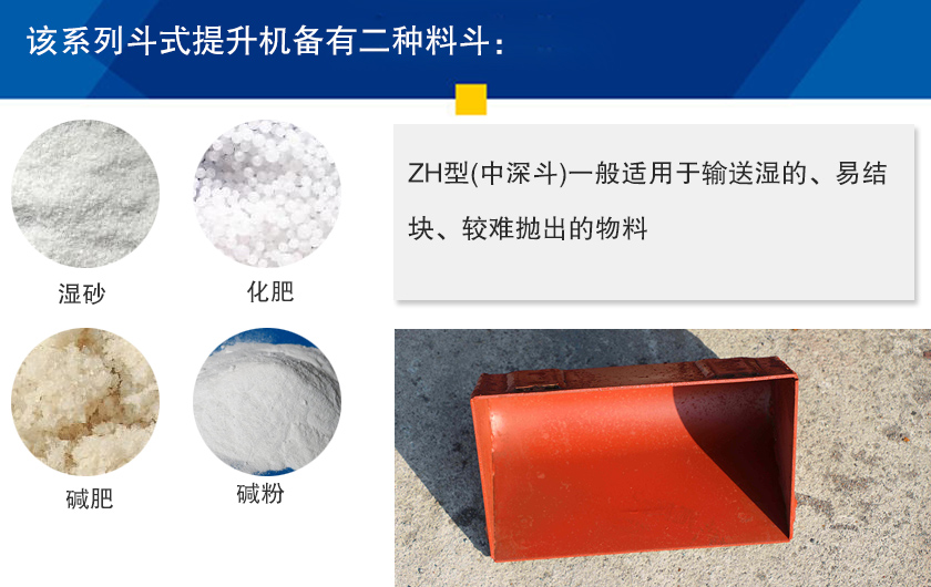 該系列斗式提升機備有二種料斗:ZH型(中深斗)一般適用于輸送濕的、易結塊、較難拋出的物料,如濕砂、化肥、堿肥、堿粉等。SH型(深斗)一般適用于輸送干燥的、松散易于拋出的物料,如水泥、碎石、煤塊等。