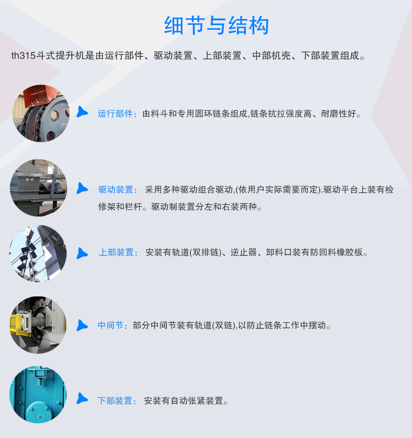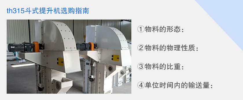th315斗式提升機斗寬為315mm,料斗容積為6升,斗速1.4米/秒,適合輸送粉末狀,顆粒狀及小塊狀物料,th315斗式提升機輸送量為60立方/時,可選用碳鋼或不銹鋼材質.