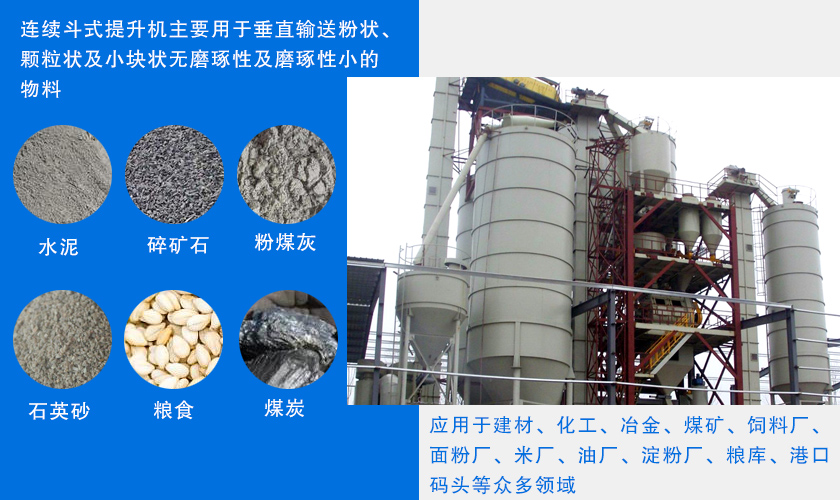 連續(xù)斗式提升機(jī)主要用于垂直輸送粉狀、顆粒狀及小塊狀無磨琢性及磨琢性小的物料,如:水泥、糧食、煤炭、粉煤灰、碎礦石、石英砂、石塊、粘土、化肥等,應(yīng)用于建材、化工、冶金、煤礦、飼料廠、面粉廠、米廠、油廠、淀粉廠、糧庫、港口碼頭等眾多領(lǐng)域。