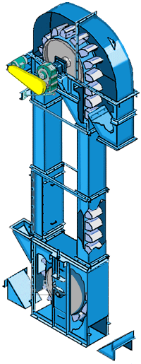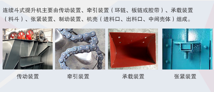 連續(xù)斗式提升機(jī)主要由傳動裝置、牽引裝置(環(huán)鏈、板鏈或膠帶)、承載裝置(料斗)、張緊裝置、制動裝置、機(jī)殼(進(jìn)料口、出料口、中間殼體)組成。