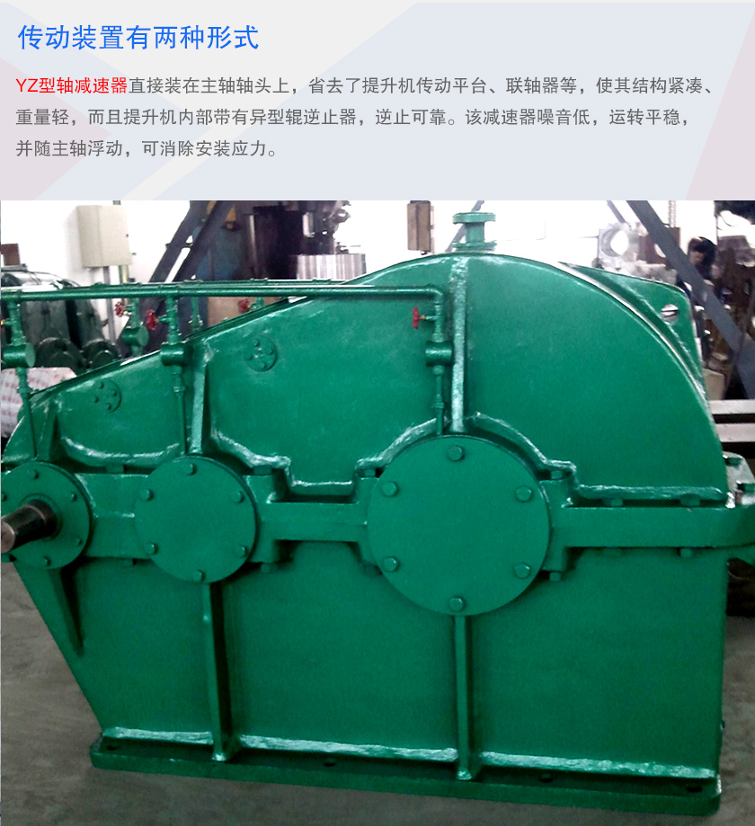 傳動裝置有兩種形式,分別配有YZ型減速器、ZQ(或YY)型減速器。YZ型軸減速器直接裝在主軸軸頭上,省去了提升機(jī)傳動平臺、聯(lián)軸器等,使其結(jié)構(gòu)緊湊、重量輕,而且提升機(jī)內(nèi)部帶有異型輥逆止器,逆止可靠。該減速器噪音低,運轉(zhuǎn)平穩(wěn),并隨主軸浮動,可消除安裝應(yīng)力。ZQ型減速器工作環(huán)境溫度為-40℃到+40℃,轉(zhuǎn)速不大于1500轉(zhuǎn)/分,齒輪傳動圓周速度不大于10米/秒,此種類型的減速器強(qiáng)度高,齒面磨損小,使用壽命長。