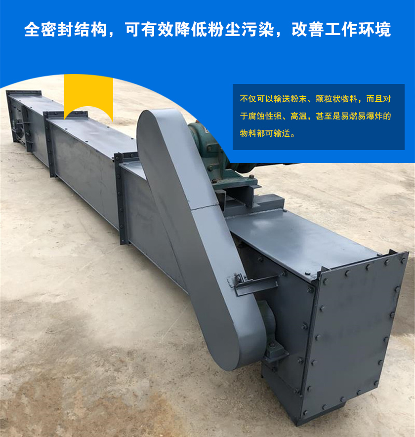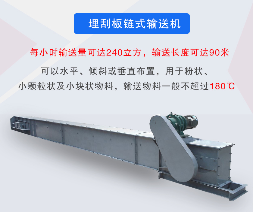 埋刮板輸送機即埋刮板輸送機,它是借助刮板鏈條在封閉的矩形斷面的殼體內連續(xù)輸送散狀物料的運輸設備,在輸送物料的過程中刮板鏈條埋于被輸送的物料之中,故而稱“埋刮板輸送機” ,可以水平、傾斜或垂直布置,用于粉狀、小顆粒狀及小塊狀物料,輸送物料一般不超過180℃。