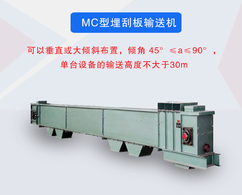 3、MC型埋刮板輸送機:可以垂直或大傾斜布置,傾角 45°≤a≤90°,單臺設備的輸送高度不大于30m。