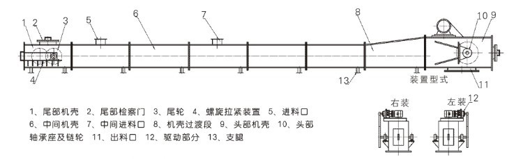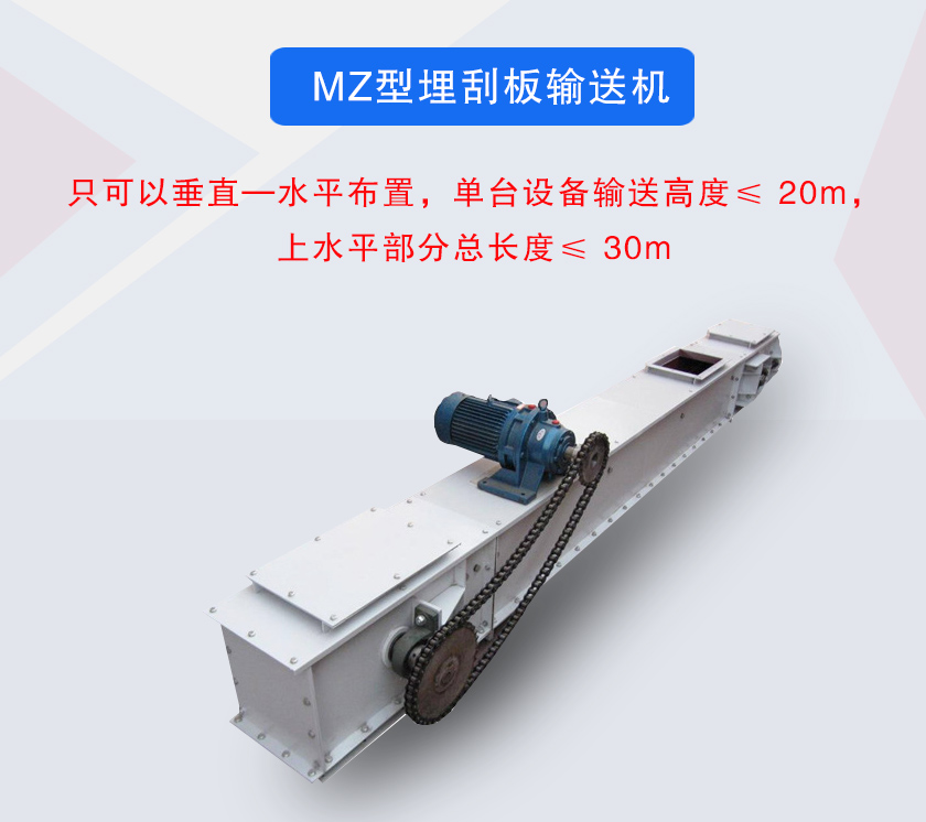 4、MZ型埋刮板輸送機,只可以垂直—水平布置,單臺設備輸送高度≤ 20m,上水平部分總長度≤ 30m。