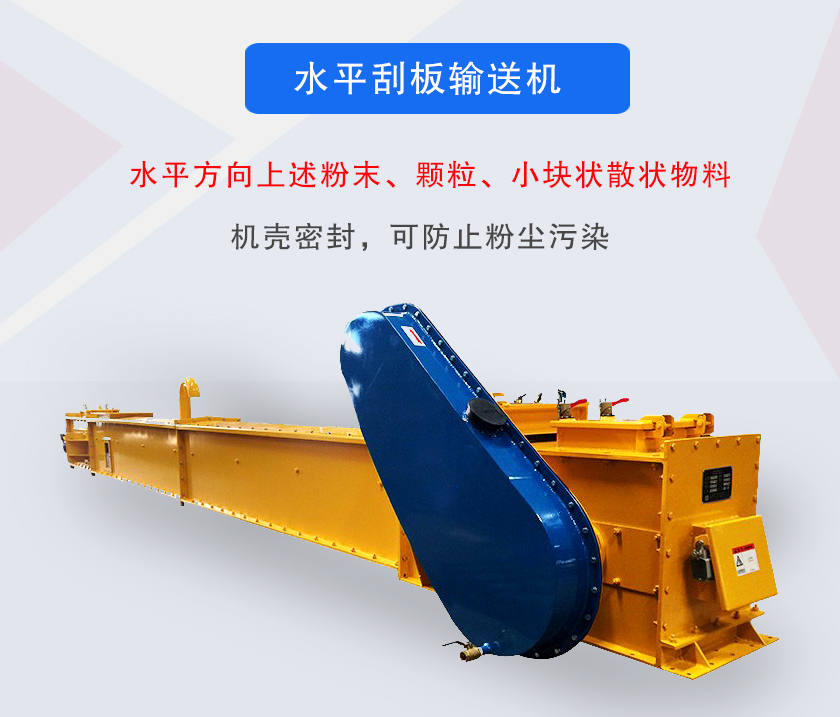 水平刮板輸送機(jī)是指水平方向上輸送粉狀及顆粒狀物料的設(shè)備,可單點(diǎn)或多點(diǎn)進(jìn)料,出料,水平刮板輸送機(jī)分為普通型、密封型和特殊型三類,采用密封式設(shè)計(jì),可防止粉塵污染.