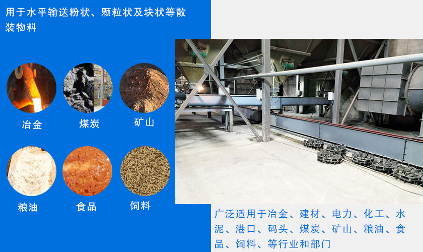 水平刮板輸送機(jī)廣泛適用于冶金、建材、電力、化工、水泥、港口、碼頭、煤炭、礦山、糧油、食品、飼料、等行業(yè)和部門,主要用于水平輸送粉狀、顆粒狀及塊狀等散裝物料。