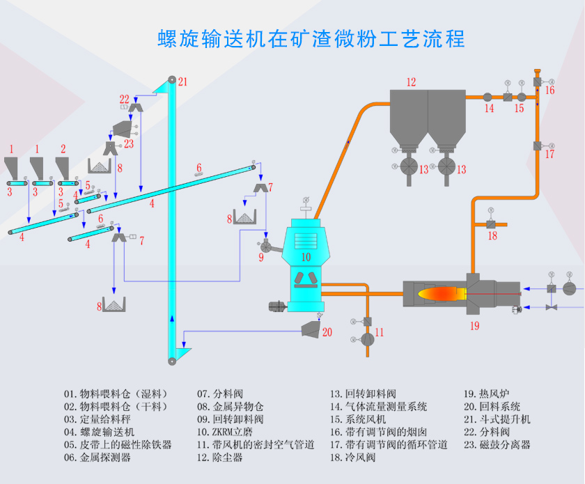 烘干后的磨渣進入磨機進行粉磨,粉磨出來的渣粉經(jīng)過選粉機進行篩選后,與磨機渣粉由螺旋輸送機送回磨機繼續(xù)粉磨,與磨機形成閉路循環(huán),合格的渣粉有螺旋輸送機送至成品倉。