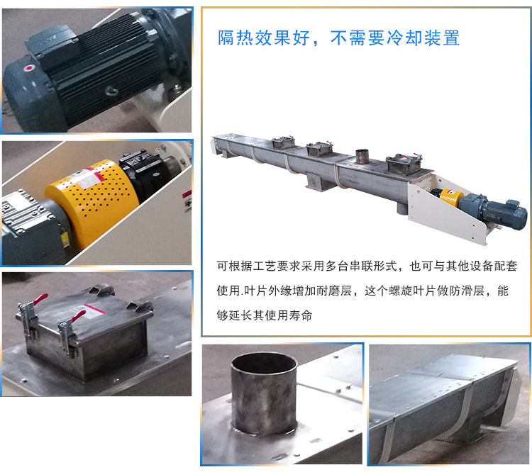 礦渣螺旋輸送機是由驅(qū)動裝置、螺旋、頭部軸承、尾部軸承、懸掛軸承、機蓋、底座等組成。驅(qū)動裝置:由電動機、減速器、聯(lián)軸器等組成。螺旋軸與吊軸承、頭部軸承、尾部軸承聯(lián)接采用嵌入舌式,安裝拆卸不需軸向移動,維修方便,采用變徑結(jié)構(gòu),增大吊軸承處的容積,避免吊軸承與物料接觸,各傳動部位采用浮動聯(lián)接方式,頭尾軸承座均在殼體外,所有軸承采用多層密封和配合密封技術(shù),軸承使用壽命長。