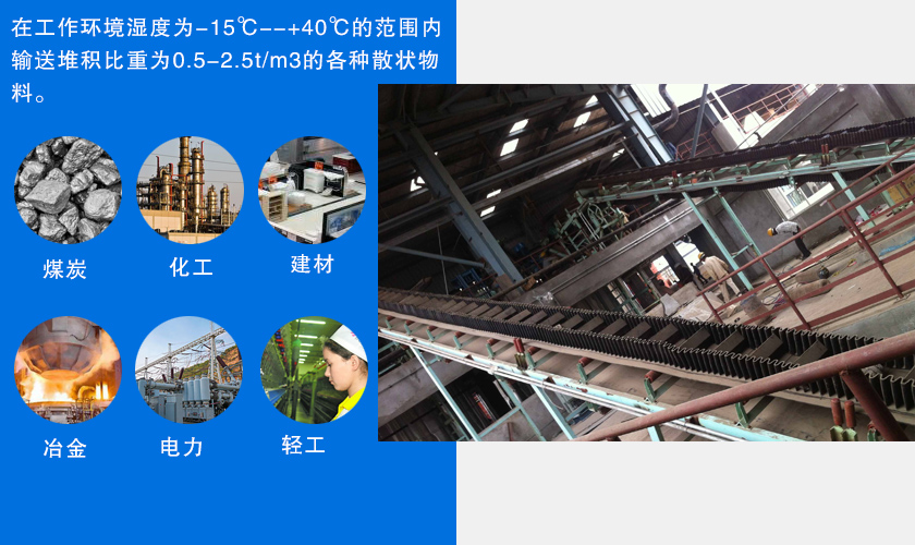 2、可用于煤炭、化工、建材、冶金、電力、輕工、糧食、港口、船舶等行業(yè),在工作環(huán)境濕度為-15℃--+40℃的范圍內(nèi)輸送堆積比重為0.5-2.5t/m3的各種散狀物料。