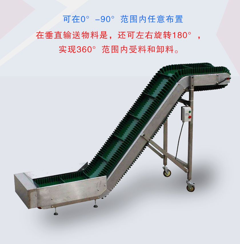 4、擋邊帶式輸送機(jī)輸送傾角0°-90°范圍內(nèi)。