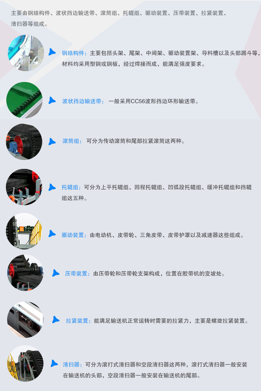 主要由鋼結(jié)構(gòu)件、波狀擋邊輸送帶、滾筒組、托輥組、驅(qū)動(dòng)裝置、壓帶裝置、拉緊裝置、清掃器等組成。