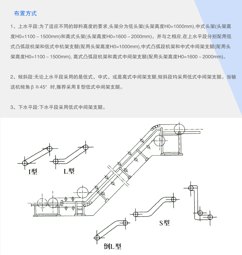 1、上水平段:為了適應(yīng)不同的卸料高度的要求,頭架分為低頭架(頭架高度H0=1000mm),中式頭架(頭架高度H0=1100~1500mm)和高式頭架(頭架高度H0=1600~2000mm)。并與之相應(yīng),在上水平段分別配用低式凸弧段機(jī)架和低式中機(jī)架支腿(配用頭架高度H0=1000mm),中式凸弧段機(jī)架和中式中間架支腿(配用頭架高度H0=1100~1500mm), 高式凸弧段機(jī)架和高式中間架支腿(配用頭架高度H0=1600~2000mm)。