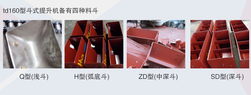 td160斗式提升機(jī)斗寬為160mm,斗速為1.4米/秒,是一種小型td斗式提升機(jī),可以垂直輸送粉狀、顆粒狀及小塊狀的磨琢性散裝物料,td160型斗式提升機(jī)備有四種料斗Q(chēng)型(淺斗)、H型(弧底斗)、ZD型(中深斗)SD型(深斗)。