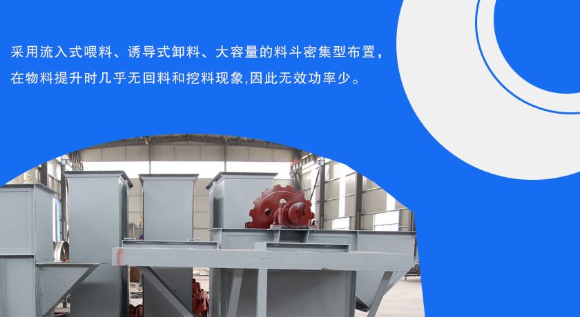 1、采用流入式喂料、誘導(dǎo)式卸料、大容量的料斗密集型布置,在物料提升時(shí)幾乎無(wú)回料和挖料現(xiàn)象,因此無(wú)效功率少。