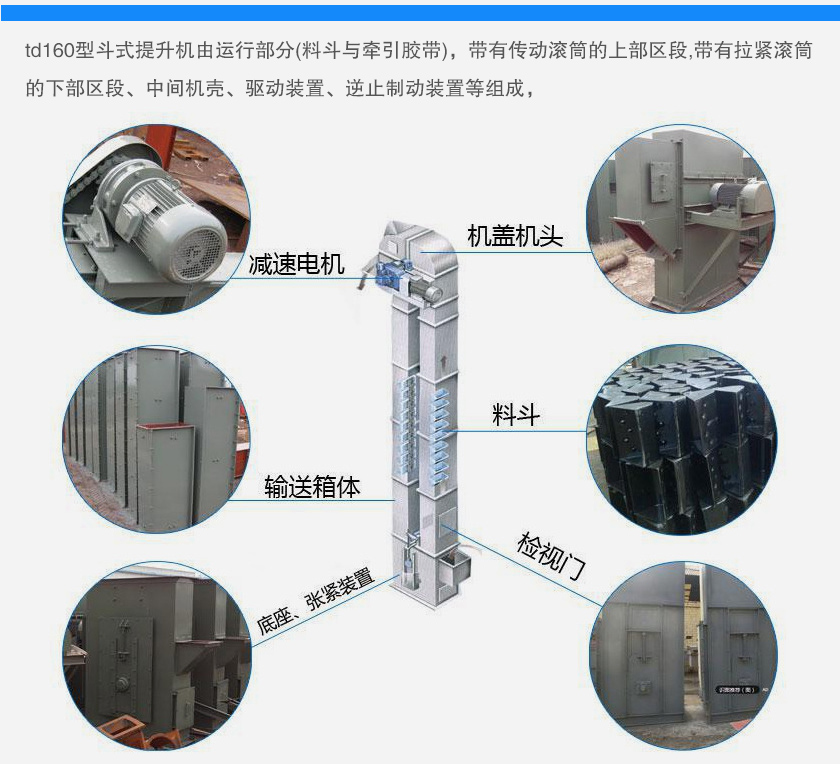 td160型斗式提升機(jī)由運(yùn)行部分(料斗與牽引膠帶),帶有傳動(dòng)滾筒的上部區(qū)段,帶有拉緊滾筒的下部區(qū)段、中間機(jī)殼、驅(qū)動(dòng)裝置、逆止制動(dòng)裝置等組成,