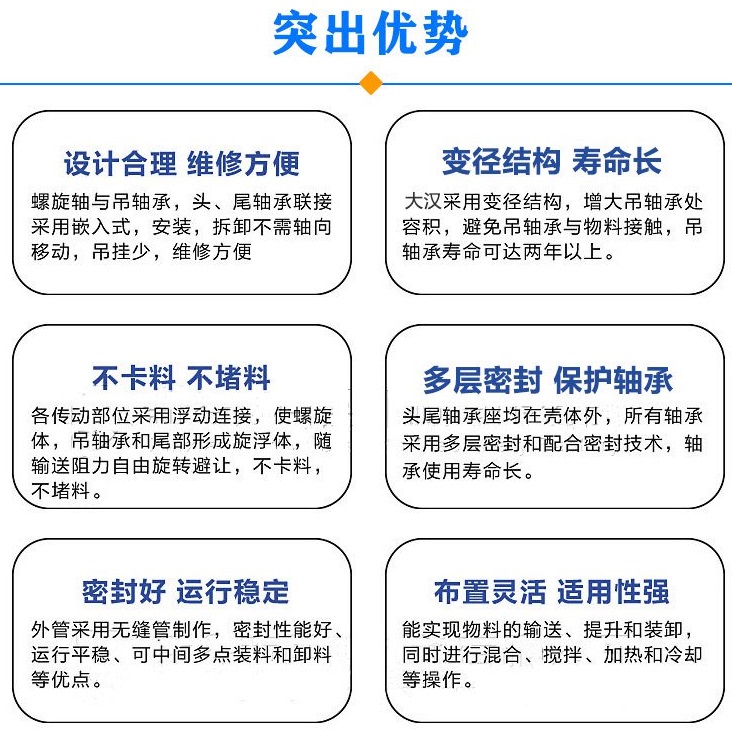易于裝載和卸載:水平螺旋輸送機可以在其輸送線上的任意點裝卸,垂直螺旋輸送機與螺旋喂料裝置相比具有優(yōu)越的喂料能力。