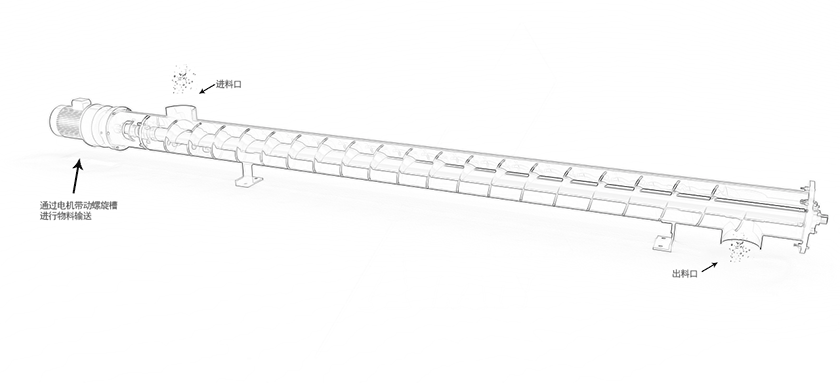 產(chǎn)品經(jīng)進料口輸送到螺旋輸送機殼體后,在內(nèi)螺旋槽內(nèi)受到離心力和管壁摩擦力的作用,隨螺旋葉片旋轉(zhuǎn),沿螺旋槽下滑在重力作用下,使物料不斷地向前推進輸送,最后均勻地從出料口排出。