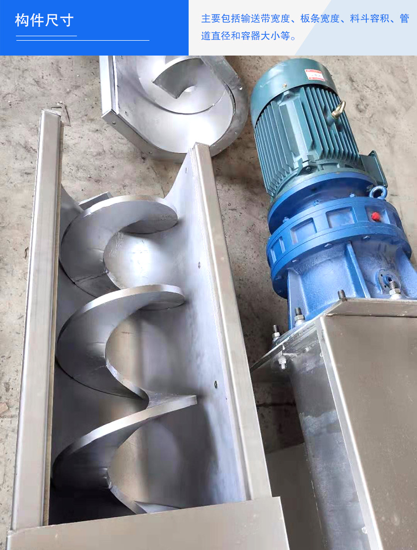 主要包括輸送帶寬度、板條寬度、料斗容積、管道直徑和容器大小等。這些構(gòu)件尺寸都直接影響螺旋給料機(jī)的輸送能力。如螺旋輸送機(jī)管徑越大,效率也就越高。當(dāng)然,并不一定就是輸送機(jī)本身才能影響效率,物料的各種性質(zhì)也都會對效率有所影響。