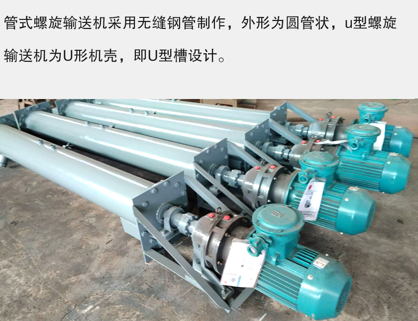 管式螺旋輸送機(jī)采用無縫鋼管制作,外形為圓管狀,u型螺旋輸送機(jī)為U形機(jī)殼,即U型槽設(shè)計。