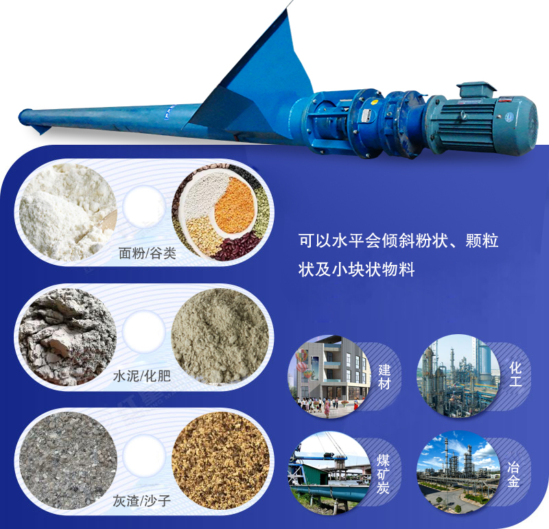 管式螺旋輸送機(jī)可以水平會傾斜粉狀、顆粒狀及小塊狀物料,如輸送面粉、谷類、水泥、化肥、灰渣、沙子、石子、煤粉、小塊煤等物料。