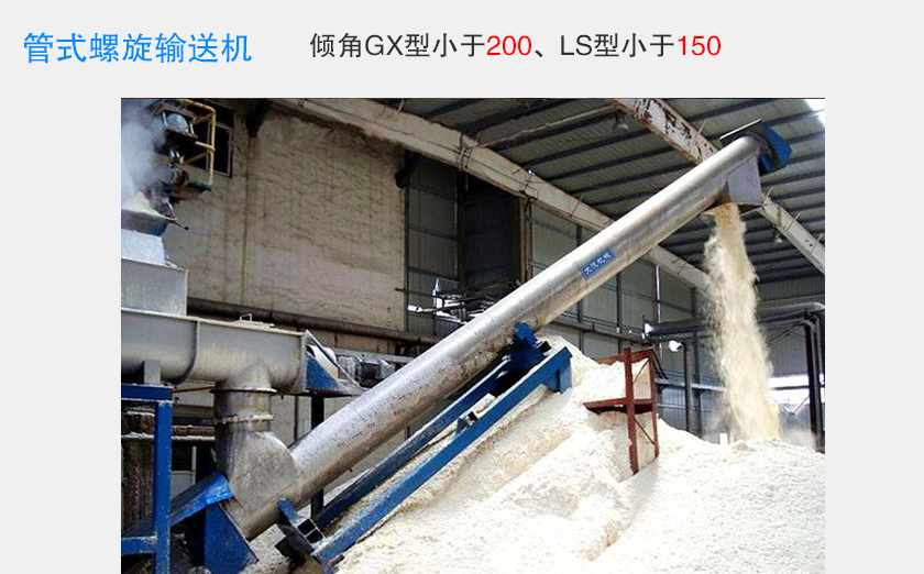 管式螺旋輸送機(jī)可布置成水平或傾斜輸送形式(傾角GX型小于200°、LS型小于150°)。