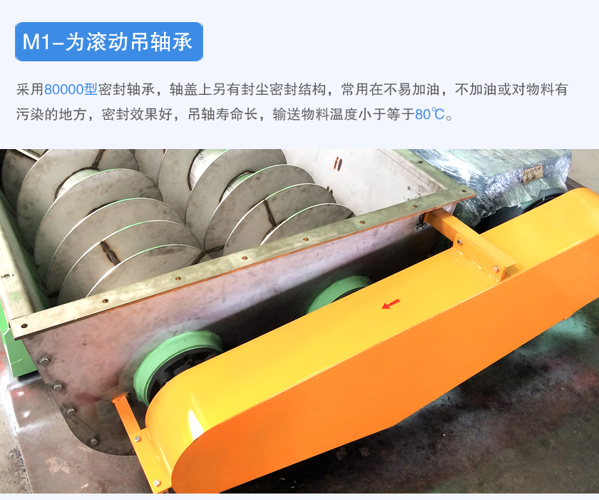 采用80000型密封軸承,軸蓋上另有封塵密封結(jié)構(gòu),常用在不易加油,不加油或?qū)ξ锪嫌形廴镜牡胤剑芊庑Ч?,吊軸壽命長(zhǎng),輸送物料溫度小于等于80℃。